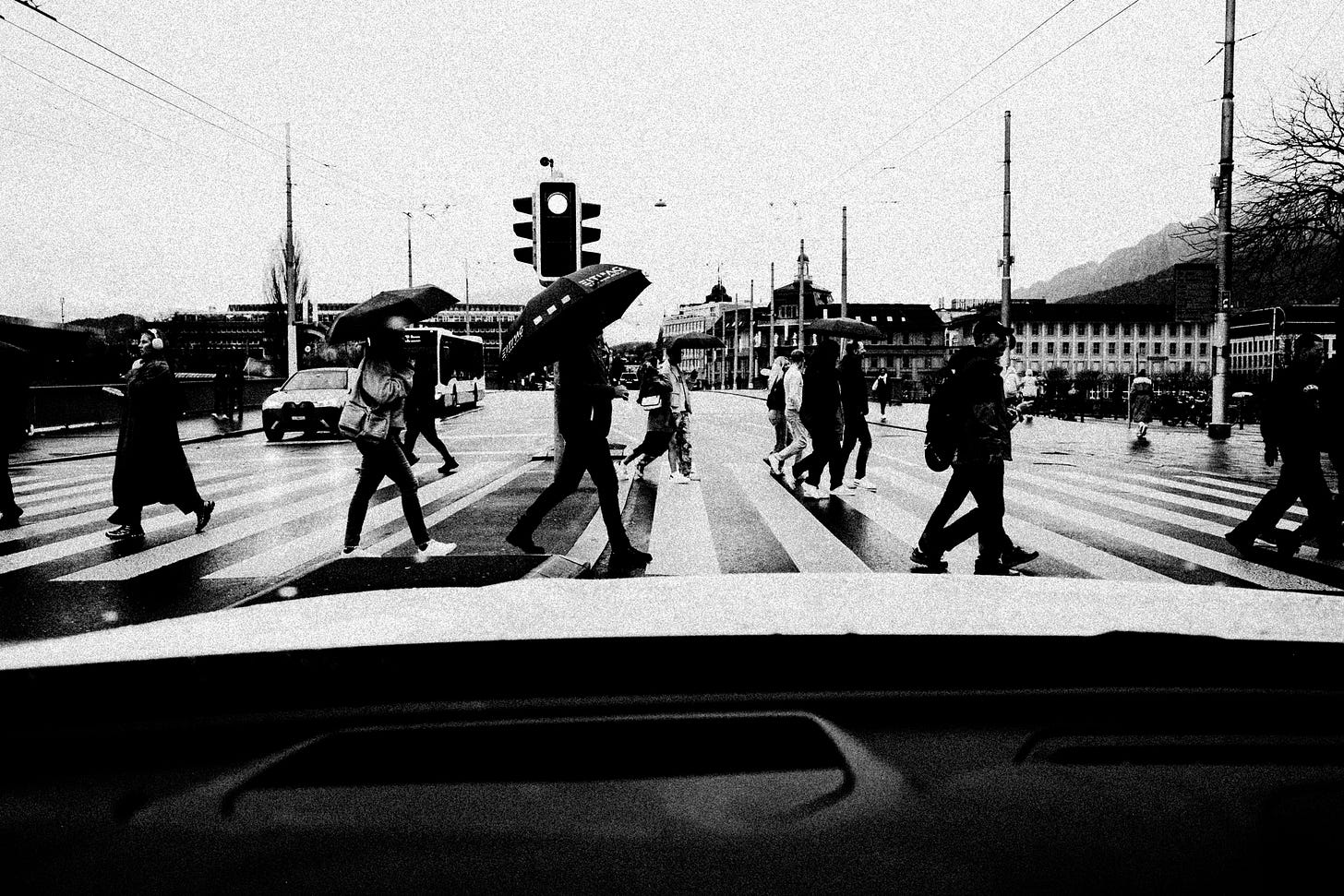 A crosswalk, on a rainy day, should be nothing more than a place to get from one side to the other. But when I looked at this moment through the camera, the street suddenly behaved like a small stage. People stepped into the frame in their own rhythms—umbrellas tilting like props, legs cutting across the stripes, strangers moving together without ever acknowledging one another.