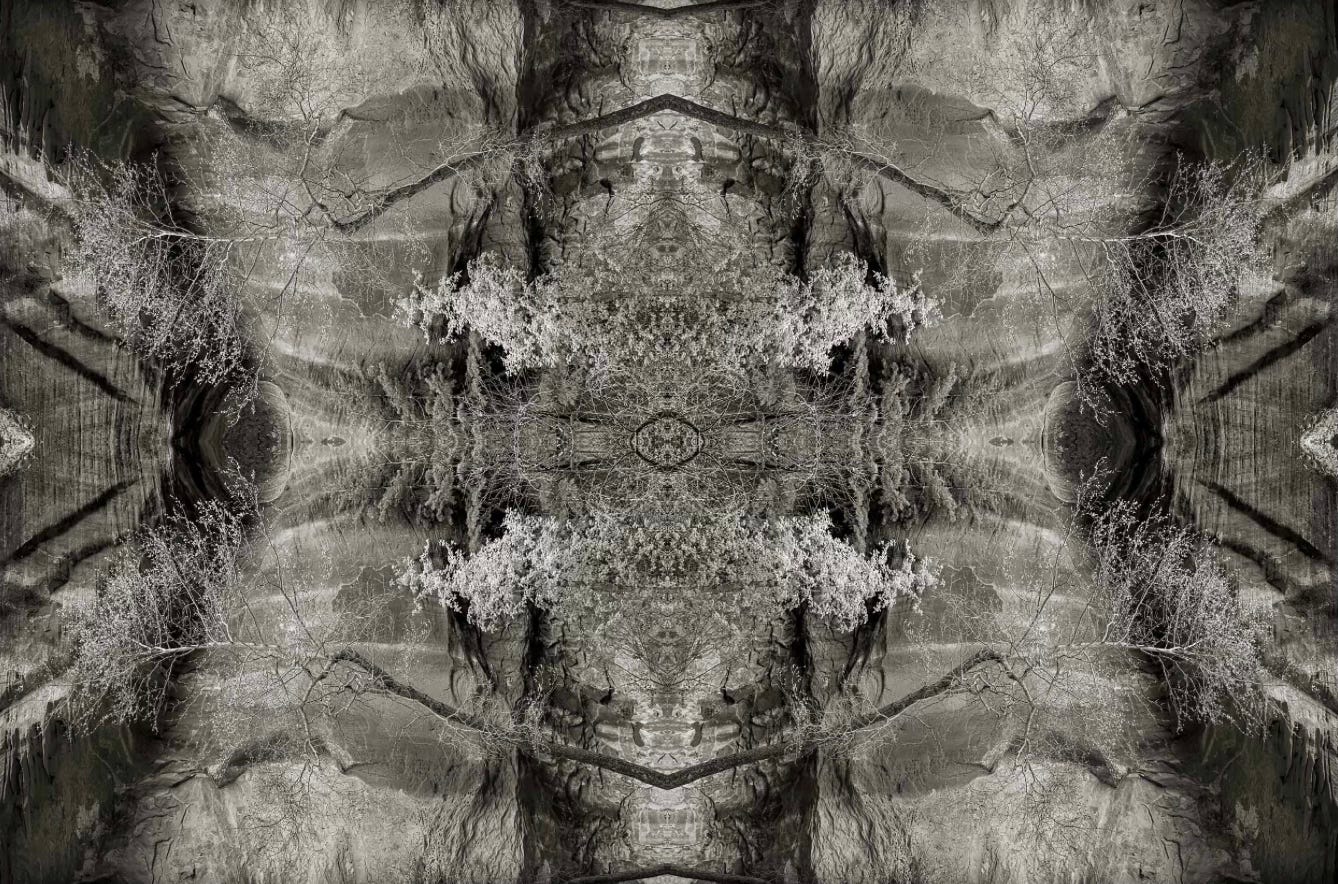 Jeff Zaruba’s work combines landscape-based imagery with digitally constructed compositions, often using repetition, duplicate layers, and mirroring to create symmetrical forms. His photographs tend to move away from straight description and toward more graphic, meditative images shaped by pattern, reflection, and formal balance.