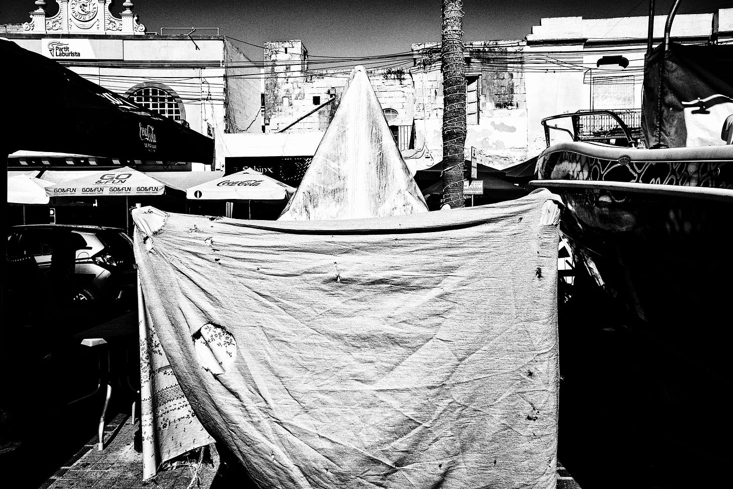 The first surprise happened when I saw the scene. I was drawn to it immediately for purely visual reasons: the rough cloth hanging in the foreground, the pointed white form behind it, the dark mass on both sides, the wires cutting across the frame, the old walls, the palm tree, the little pockets of light and shadow. It felt like one of those accidental street arrangements I love most — messy, layered, slightly absurd, and yet somehow held together by form. I was thinking about textures, tension, shapes, contrast. Nothing else.
