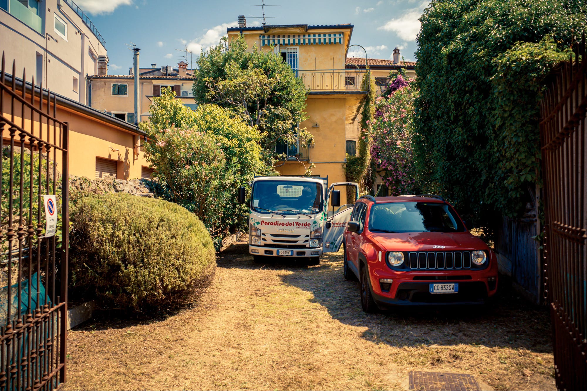 The promenade in Garda was alive with its usual summer rhythm — gelato shops, lake views, tourists strolling in the heat. But I turned into a narrow side street, away from all that polish, and found this yard. A truck, a red car, a yellow house pressed between walls of green. Nothing spectacular, yet it felt more real than the postcard view one street away.