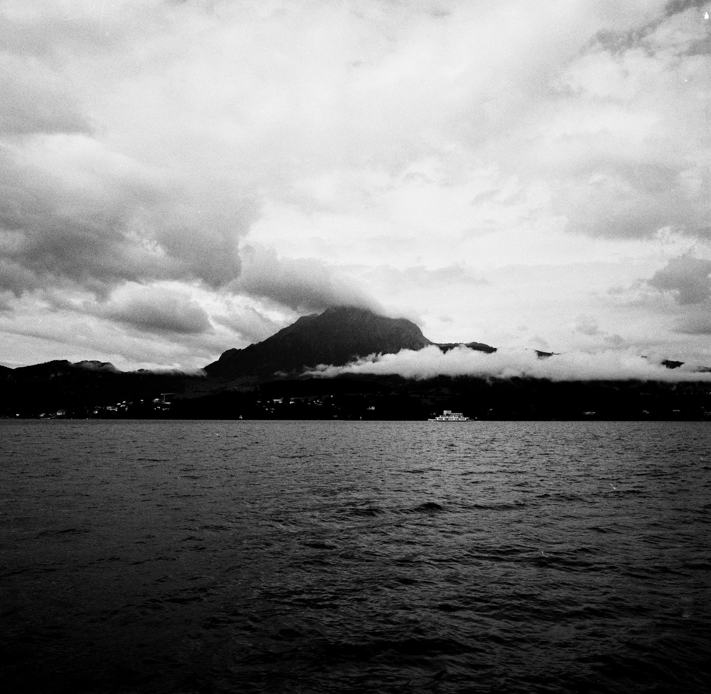 I was on a boat crossing Lake Lucerne when I made this photograph. The water was restless, the clouds heavy, and Mount Pilatus rose above it all, wrapped in a band of fog. It felt ancient, unmovable, almost indifferent. And that’s when it struck me: this mountain doesn’t care.
