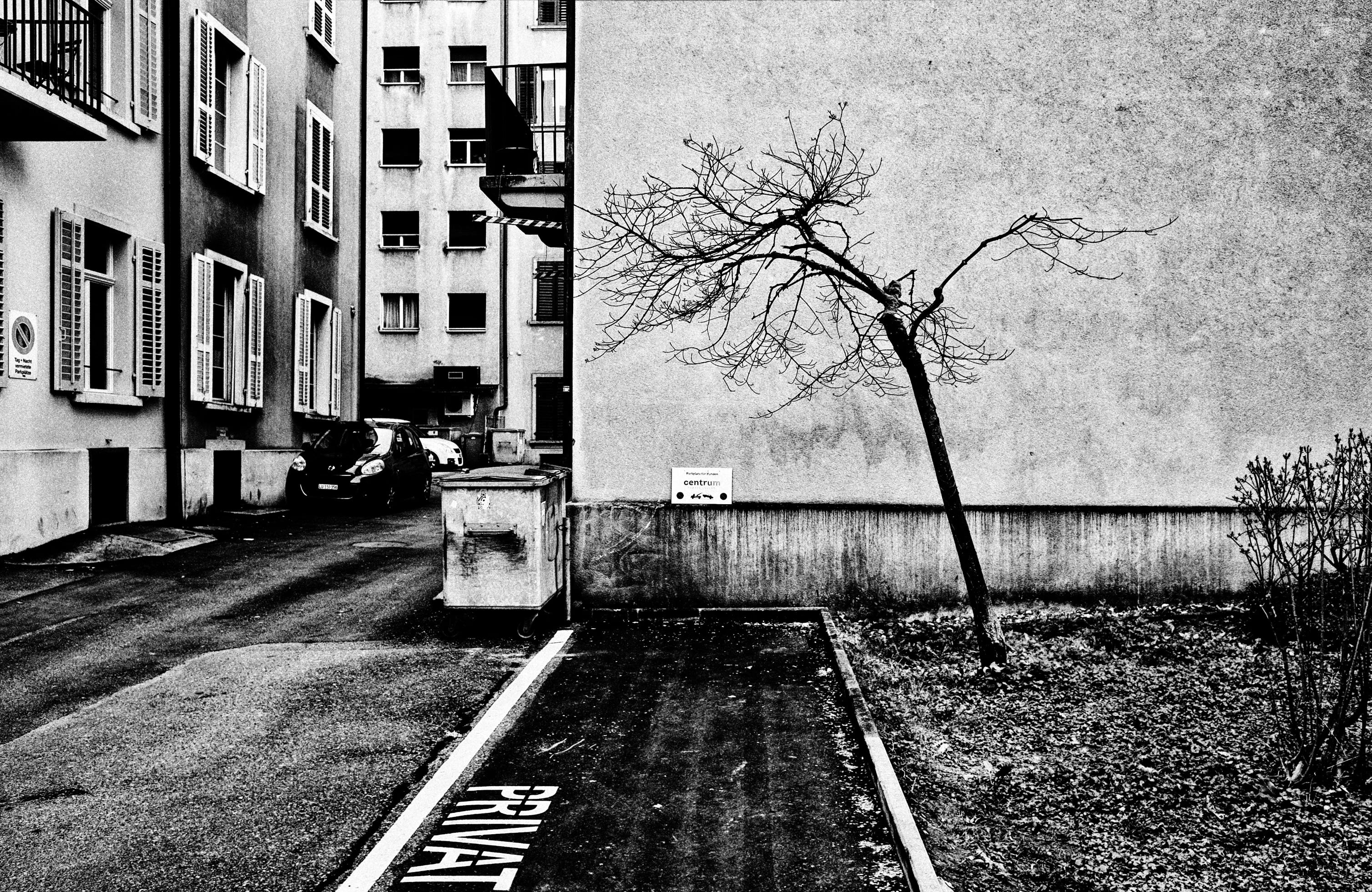 What interests me here is the relationship between things: the dense rhythm of the buildings on the left, the large empty wall on the right, the leaning tree cutting into that space, the dark strip in the foreground pulling the eye inward. In black and white, these elements stop being just parts of a place and start working as parts of a photograph.